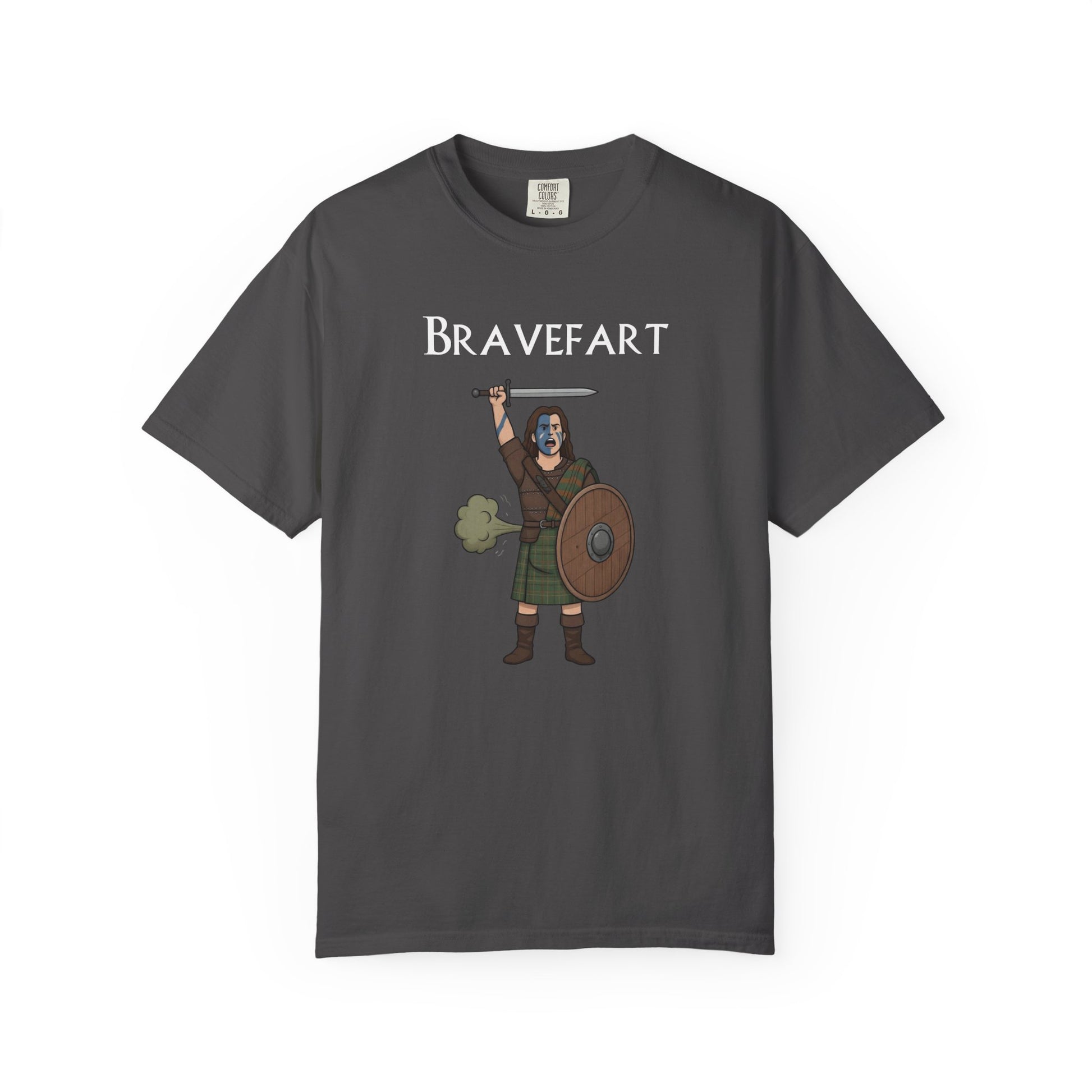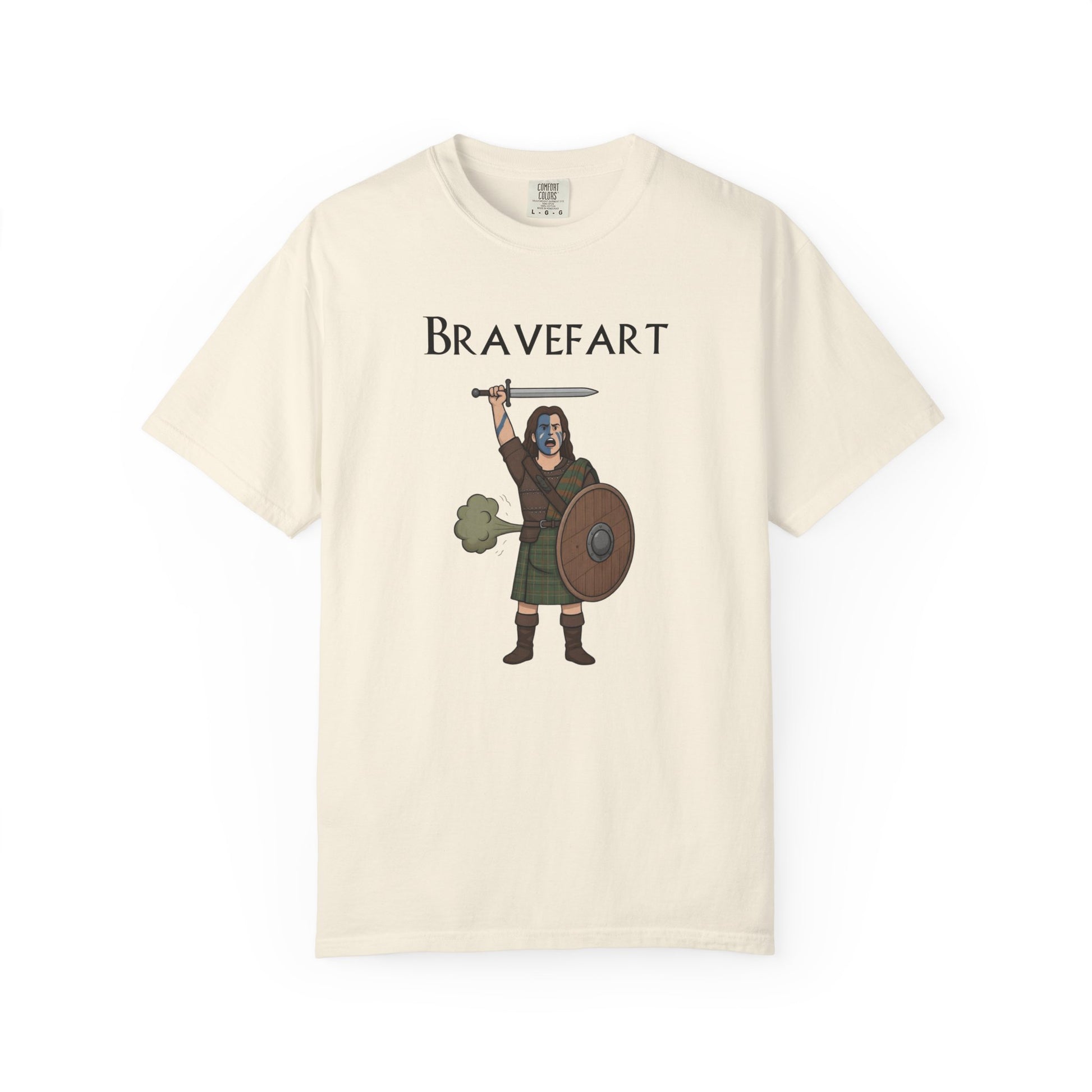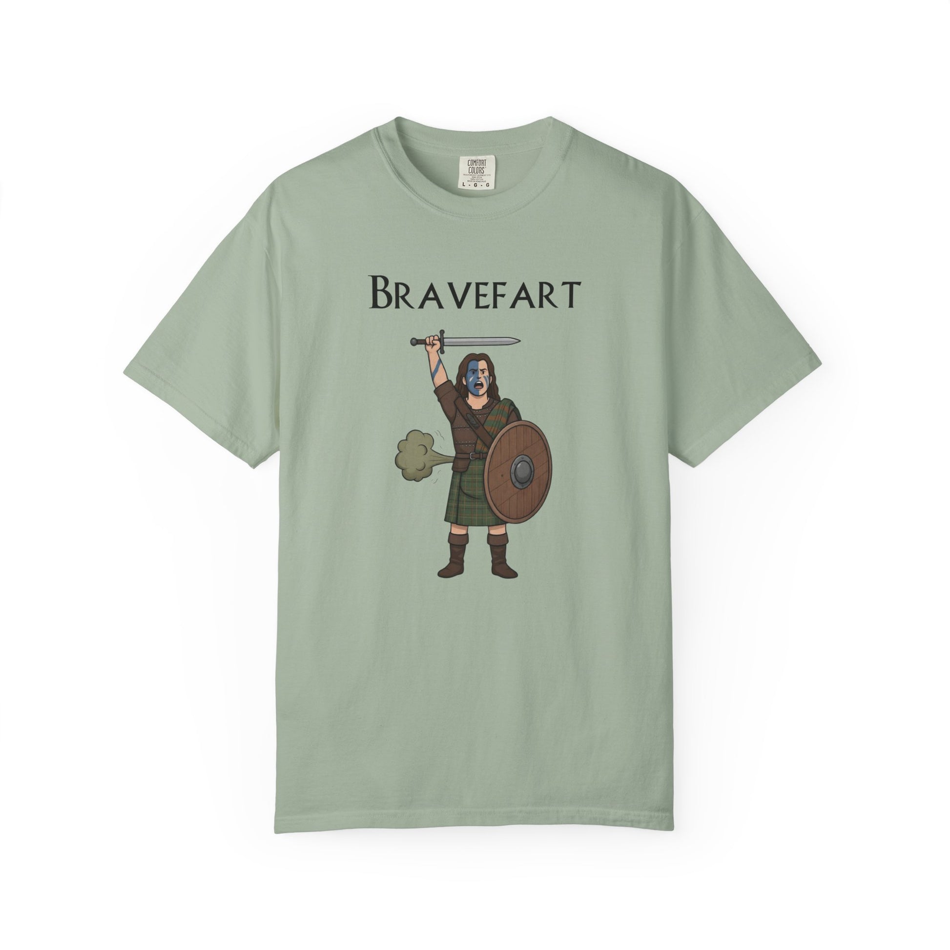 With this epic parody tee, William Wallace charges into battle—face painted blue, wild hair flying, massive sword raised high—but a huge green toxic fart cloud billows out behind him like battlefield smoke—"Bravefart": They may take our lives...but they'll never take our freedom...from farts!