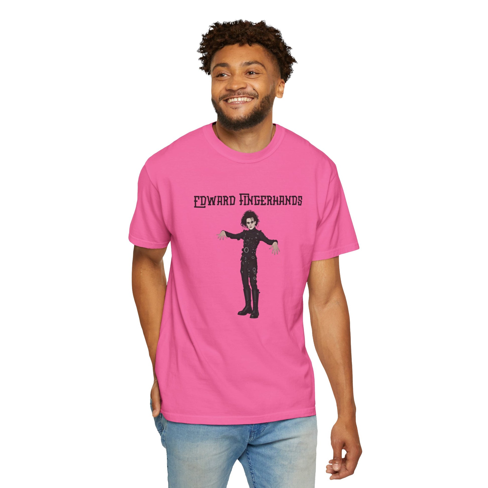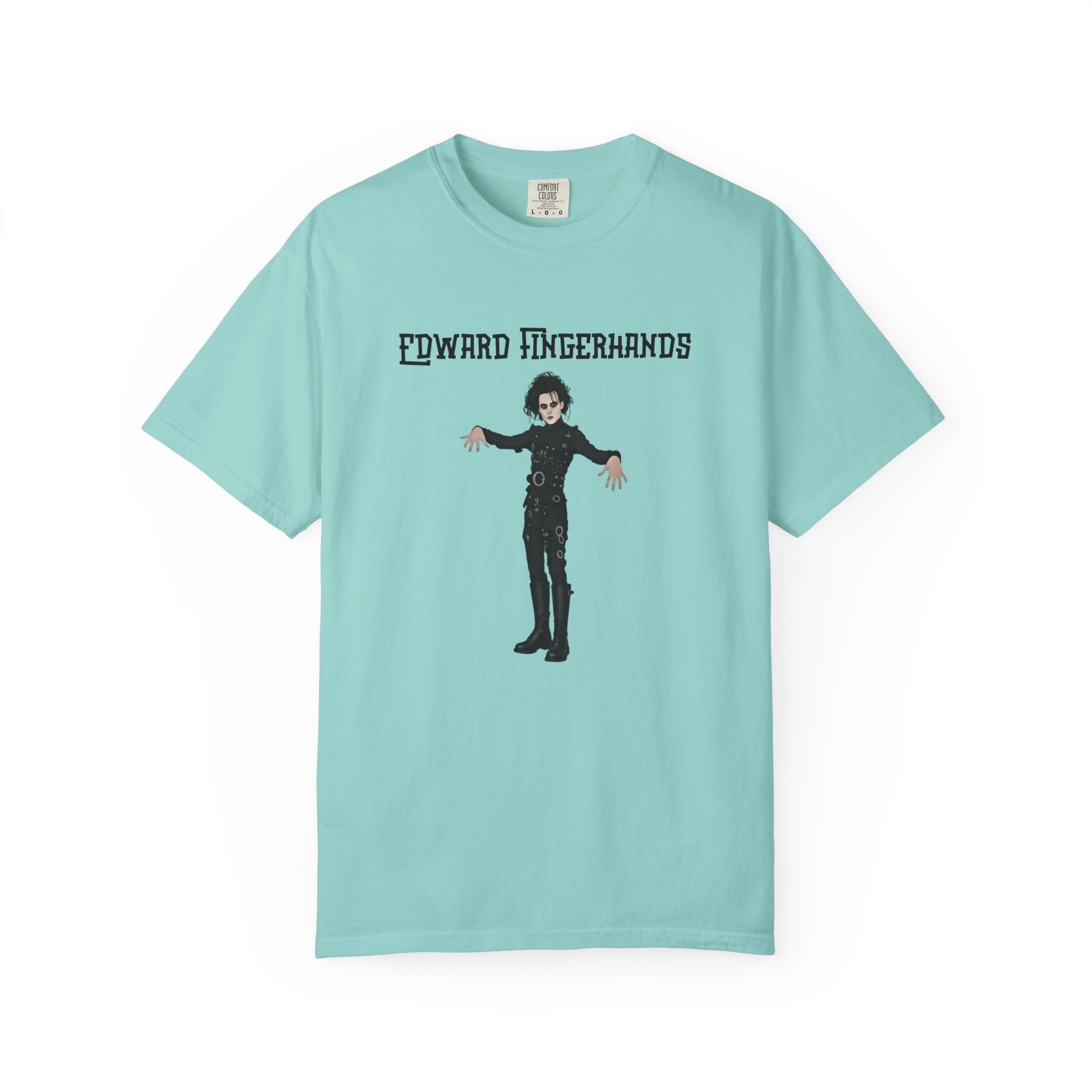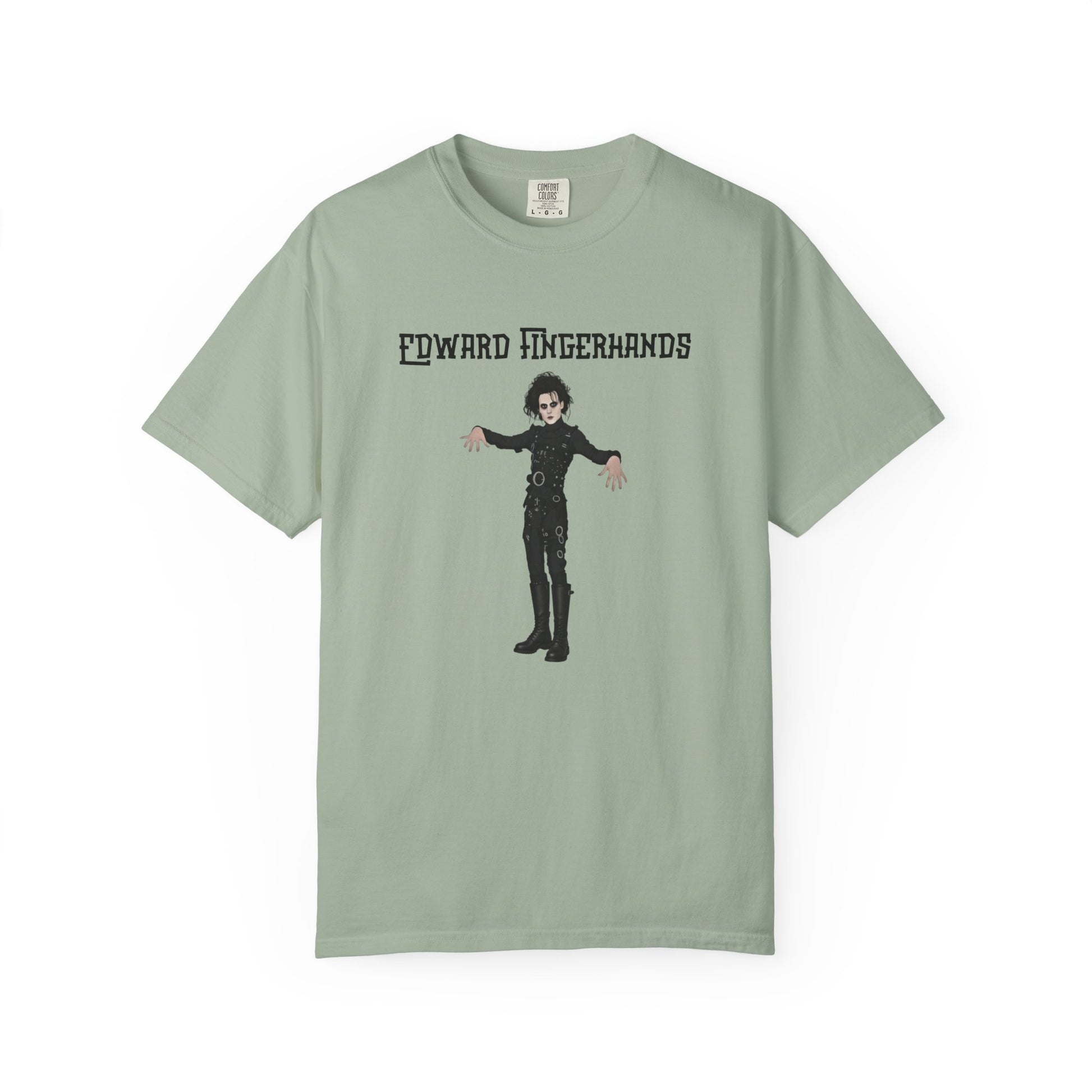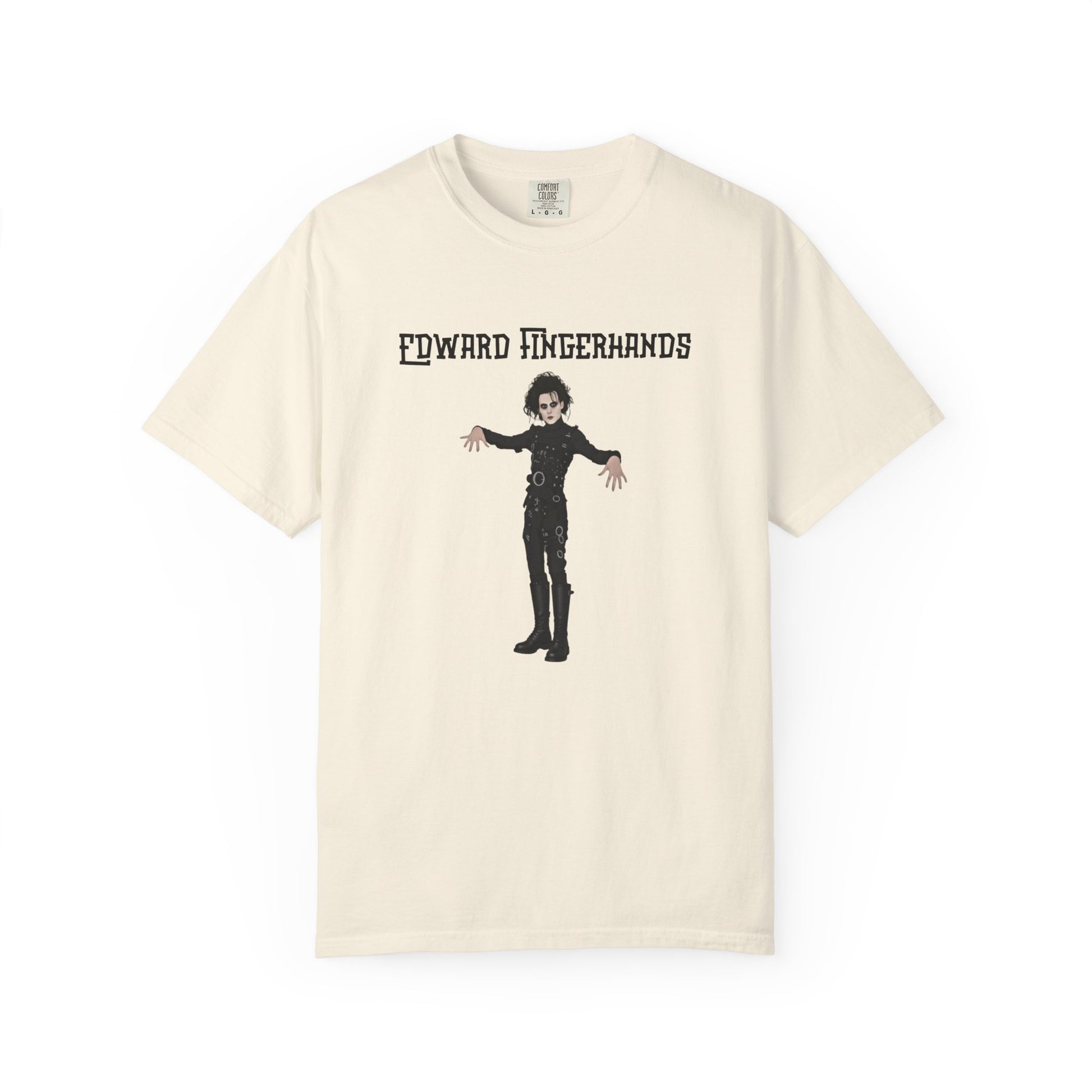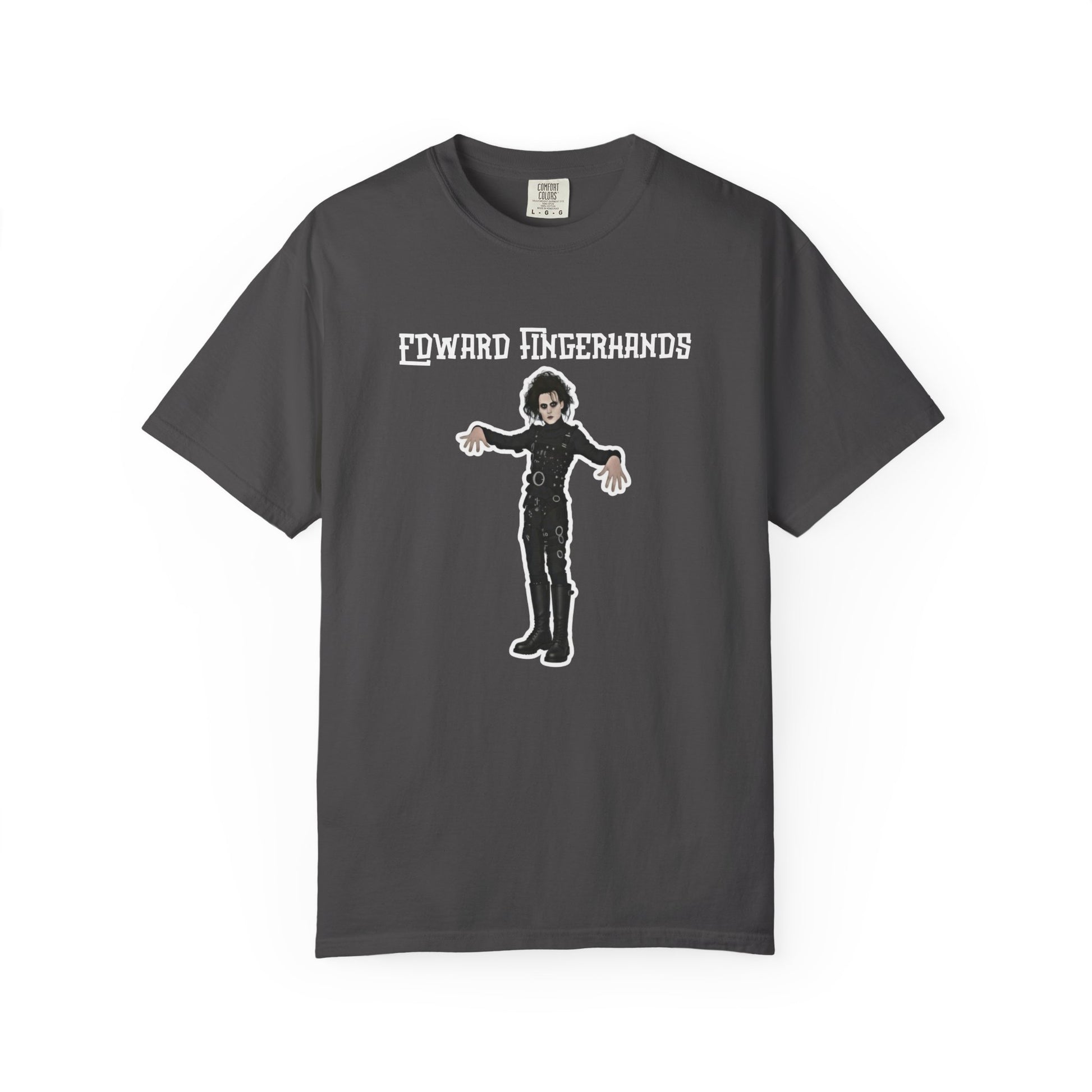 With this hilariously mundane parody tee, Edward Fingerhands stands in his classic gothic pose—pale skin, wild black hair, black leather straps—but unlike Edward Scissorhands, whose hands consist of deadly blades, Edward Fingerhands has perfectly normal, totally average human hands, fingers splayed awkwardly like he's unsure what to do with them—"Edward Fingerhands": Finally able to high-five without casualties...but the magic's kinda gone.