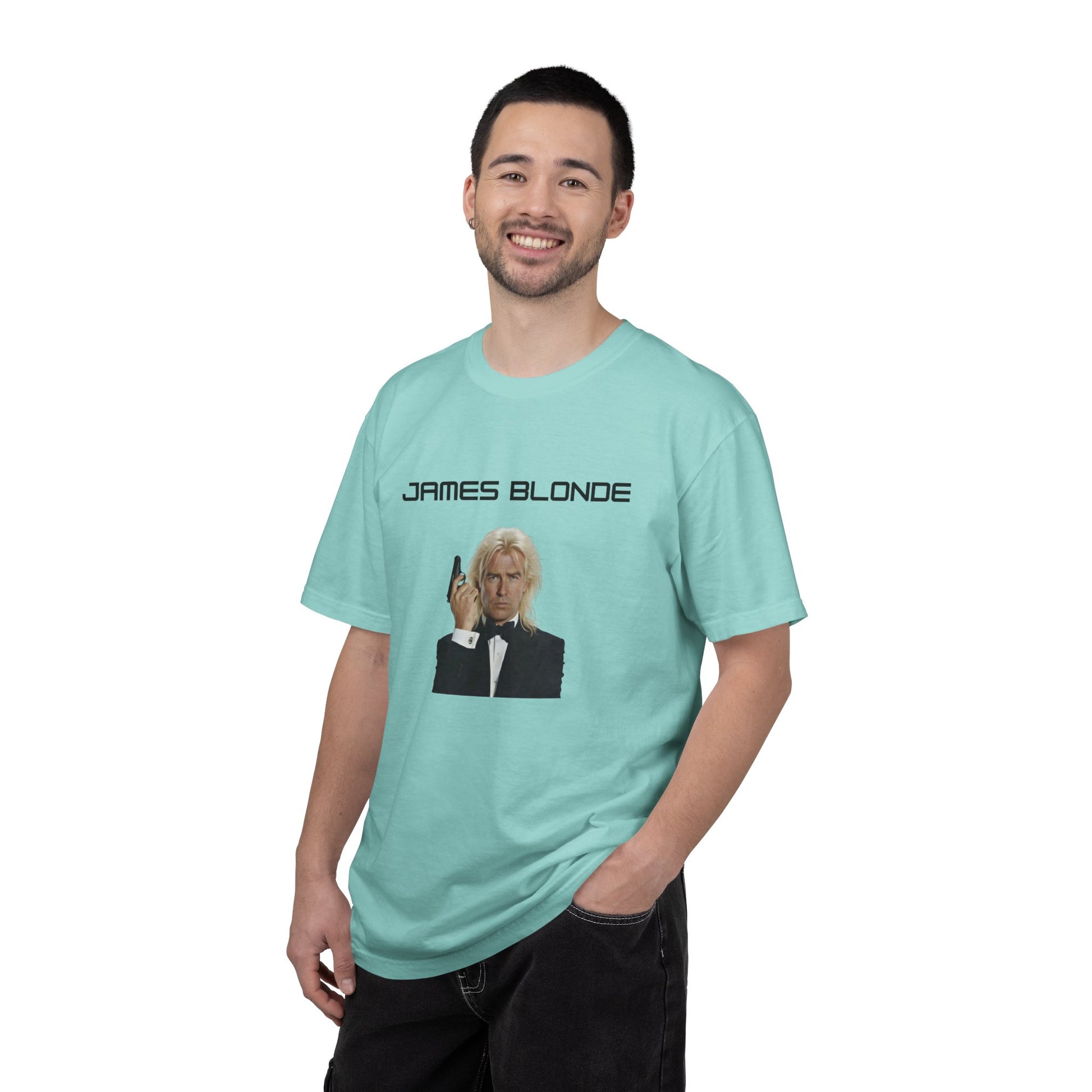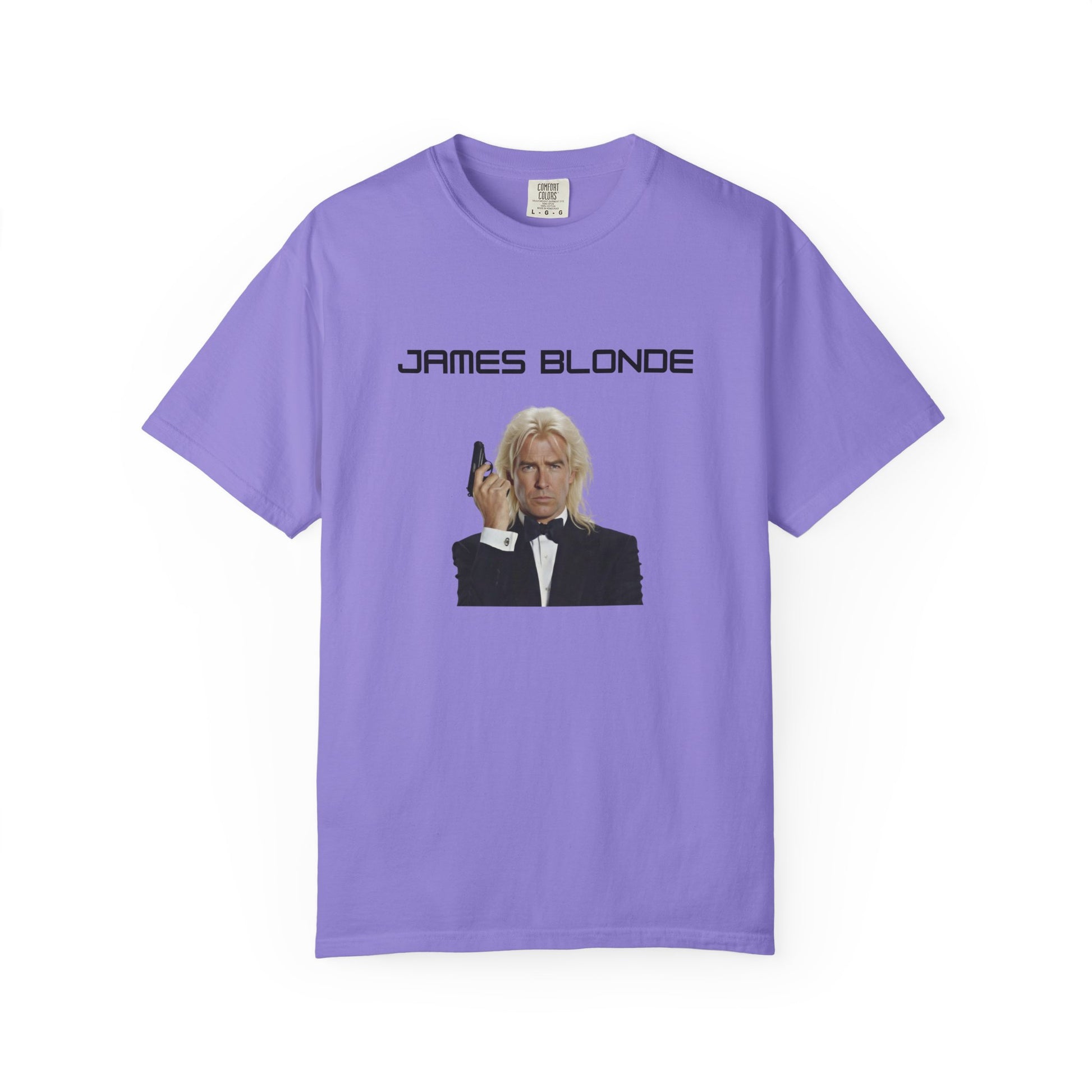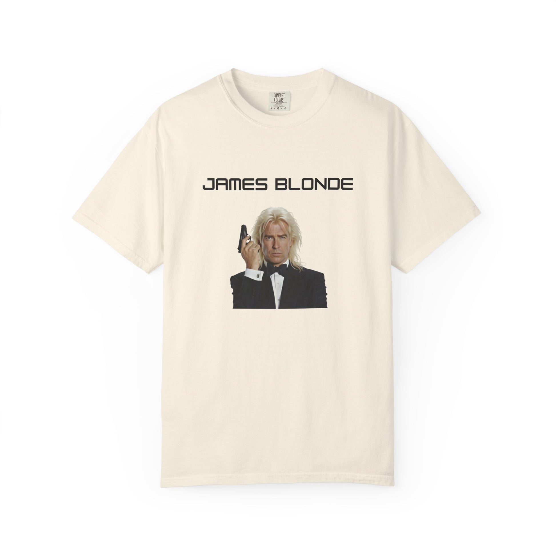 With this suave parody tee, James Bond strikes his classic tuxedo pose—Walther PPK in hand, cool smirk intact—but rocking platinum blonde, crystal hair that screams "fabulous"—James Blonde: Shaken, not stirred... but definitely highlighted. The name's Blonde. James Blonde. Grab it quick before Q branch revokes your license to thrill!
