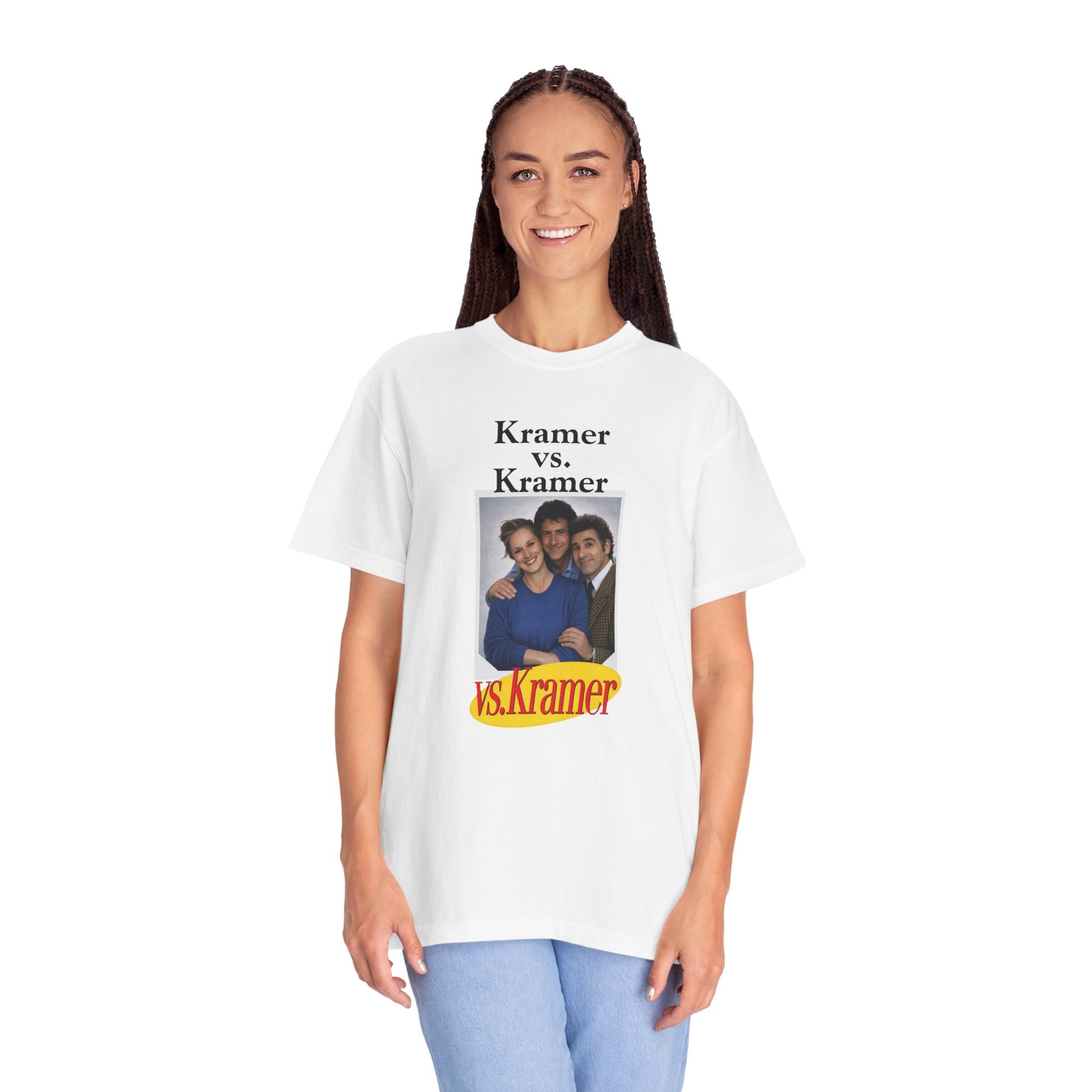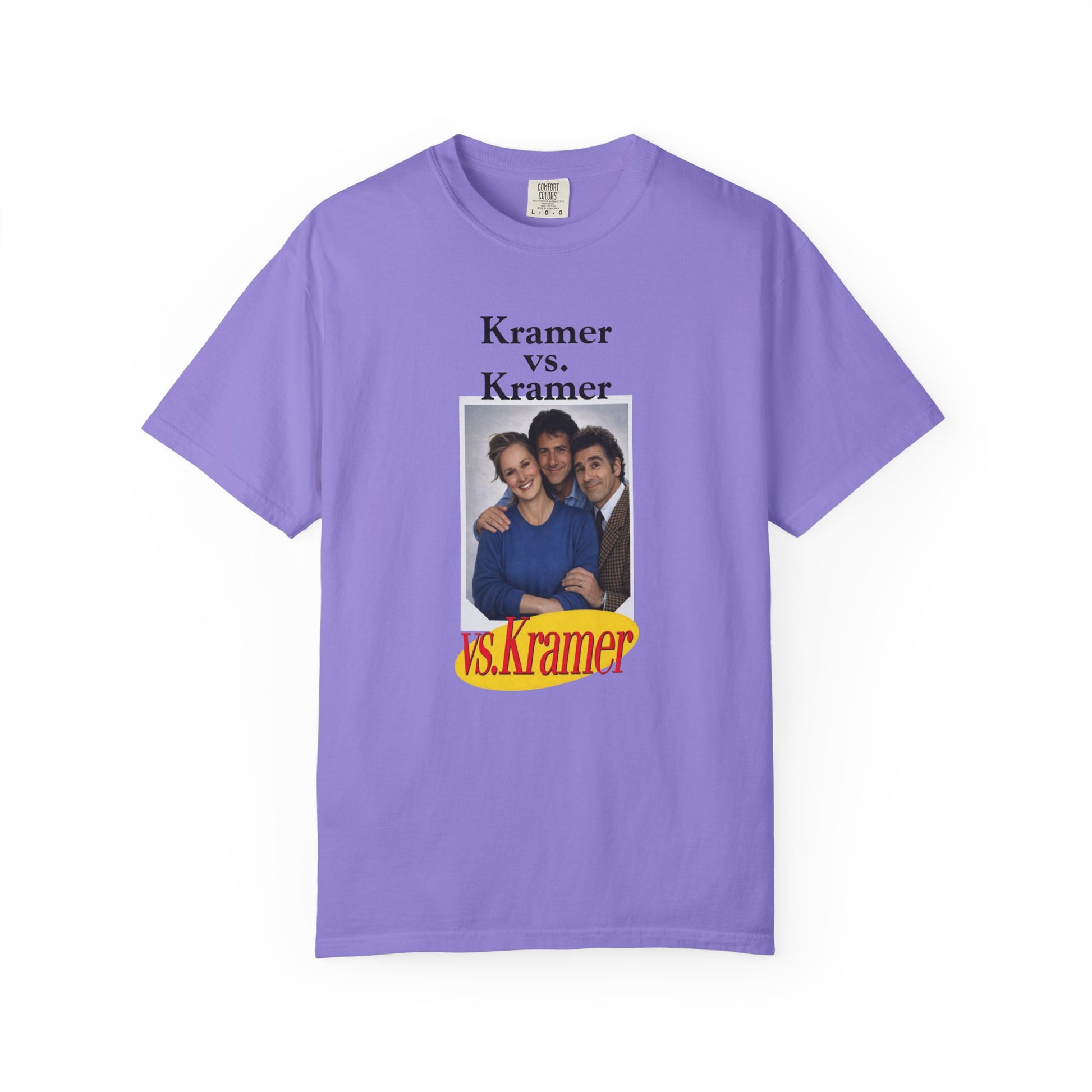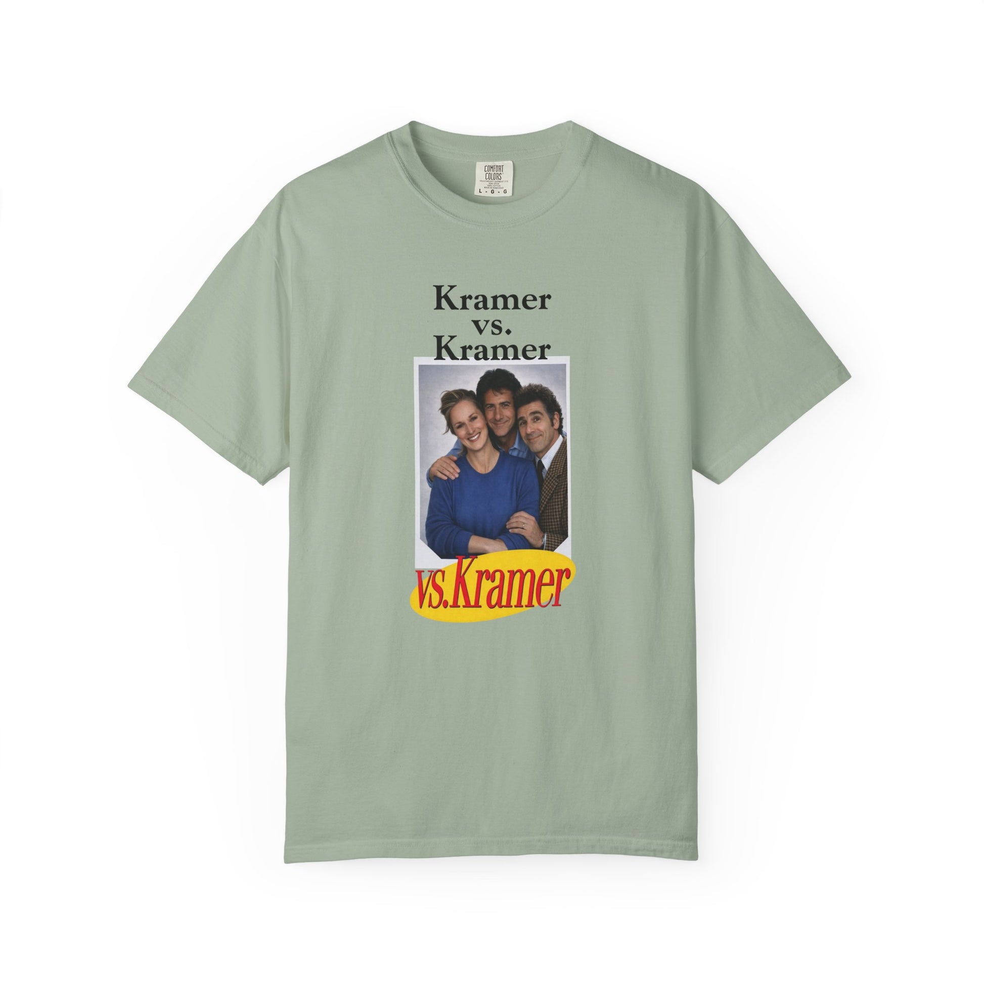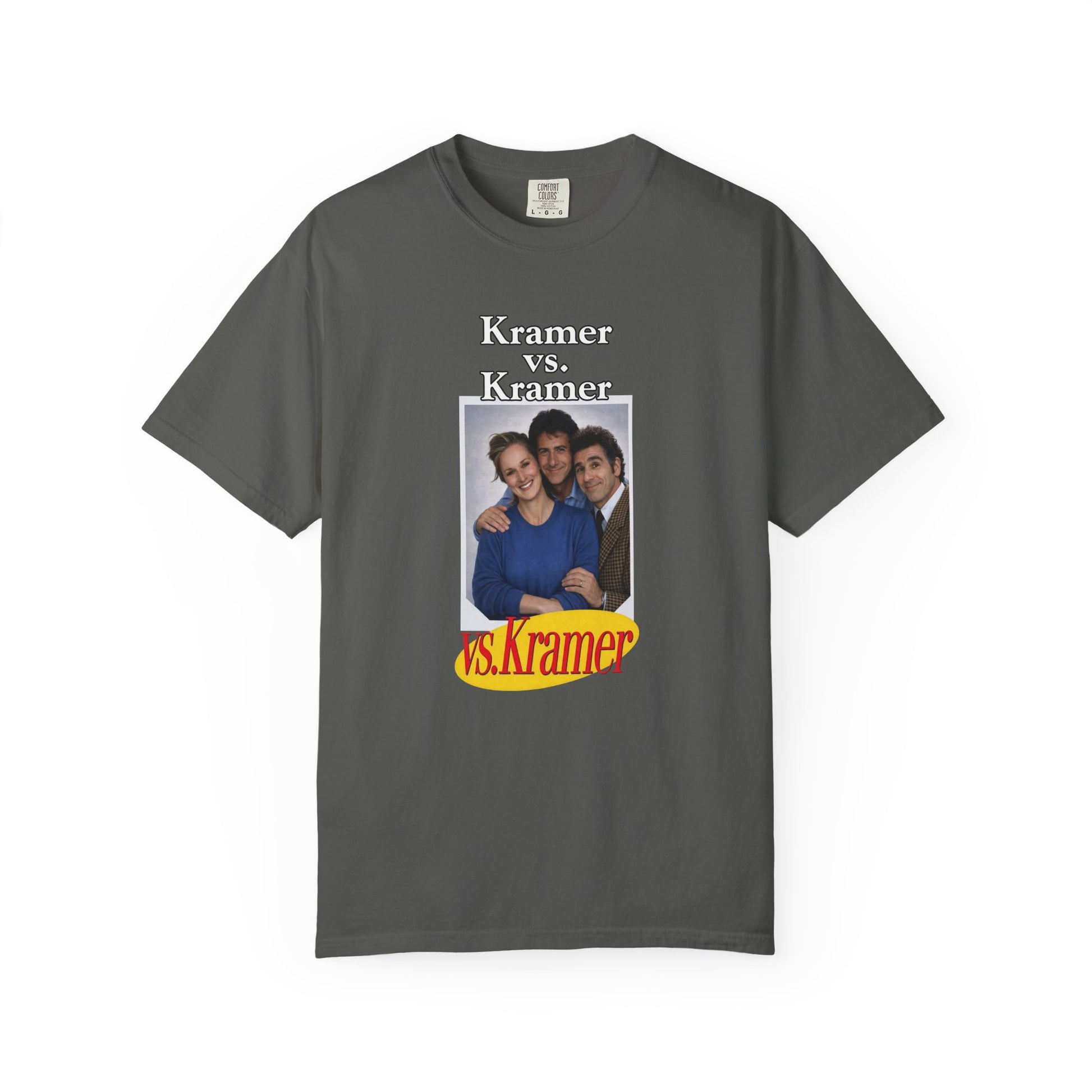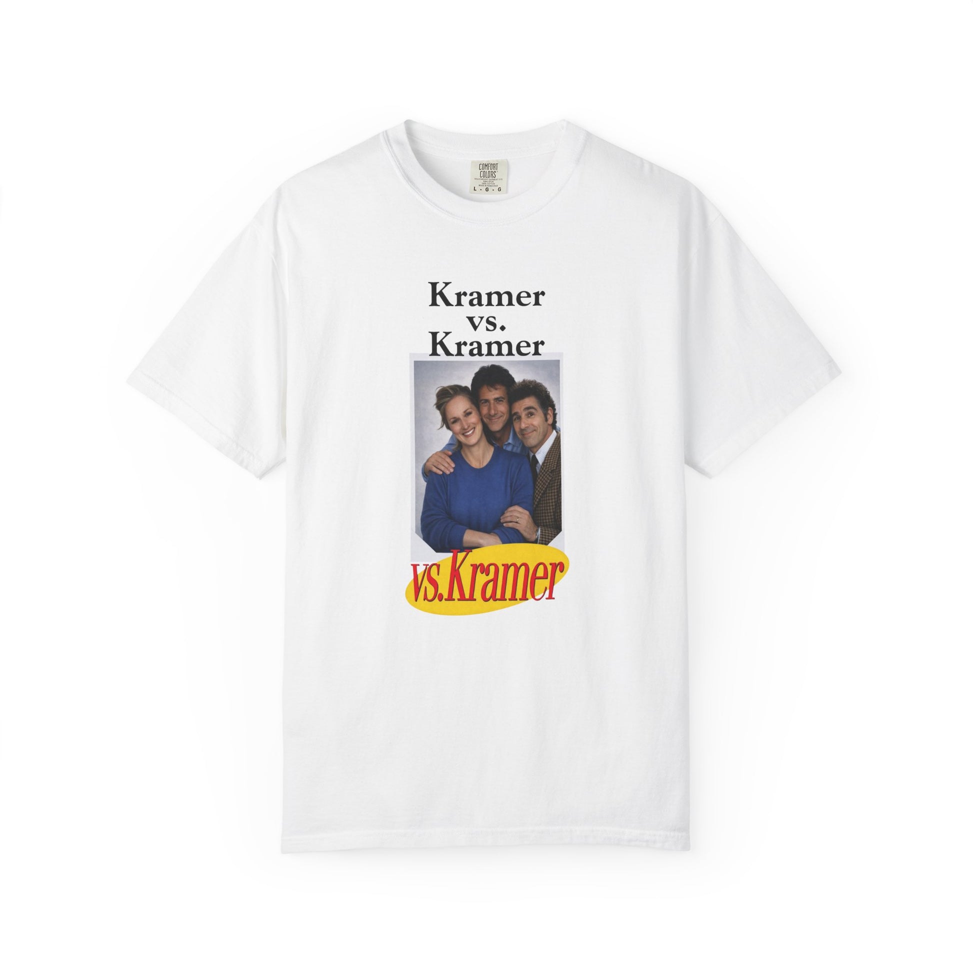 With this hilarious parody tee, Dustin Hoffman (as Ted Kramer), Meryl Streep (as Joanna Kramer) and Michael Richards (as Cosmo Kramer) enjoy the calm before the storm, taking a nice family photo together before being thrust into one of the most dramatic court cases Manhattan has ever seen (and will ever see again). Order now before Bob Sacamano snags them all to sell on the Black Market to pay for that bum knee repair!
