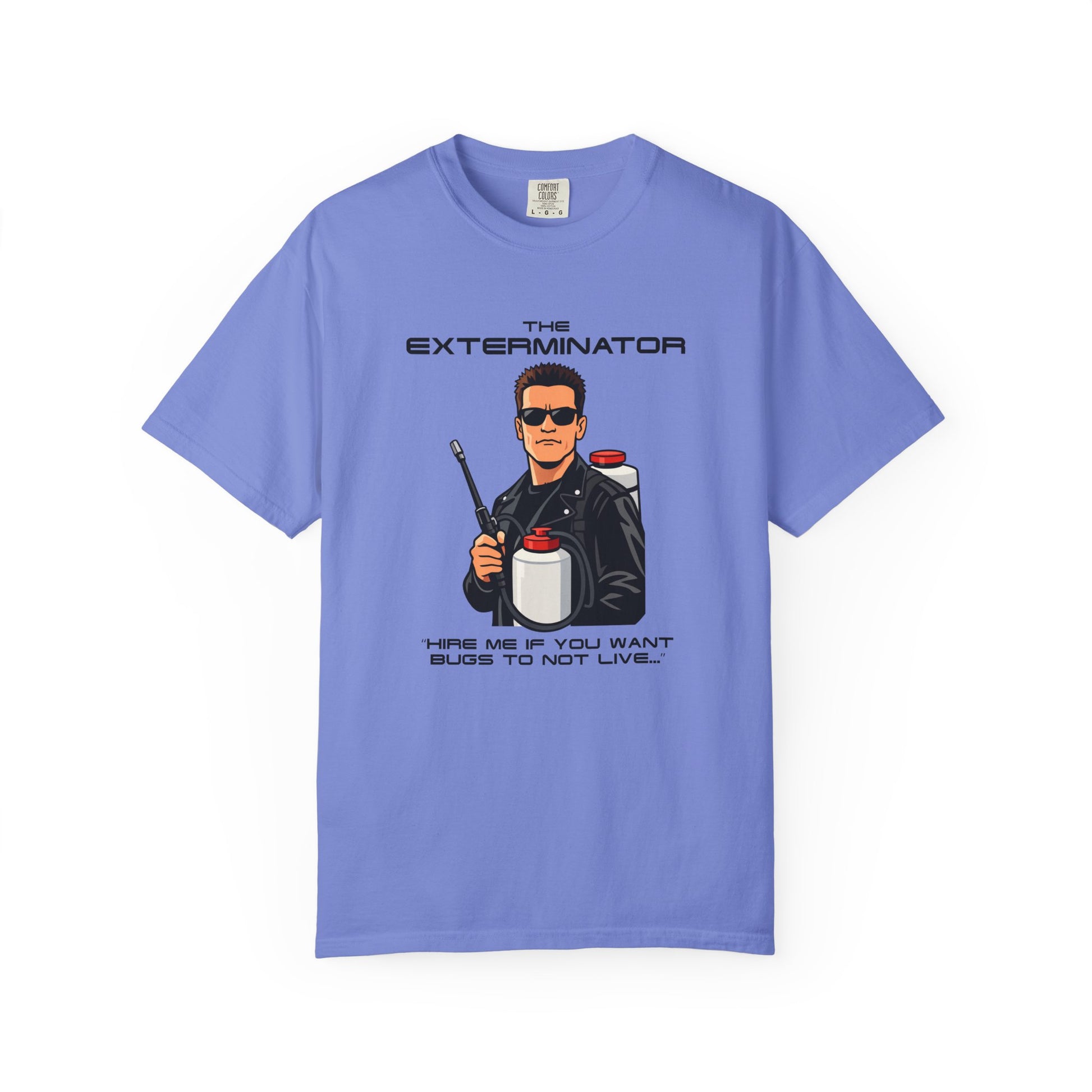 With this relentless parody tee, the T-800 cyborg strides in full leather jacket and shades, but swapped for exterminator gear: backpack fogger, pesticide shotgun sprayer in hand, deadpan stare locked on the pests—"THE EXTERMINATOR": He'll be back... after he terminates every last roach. No fate but what we spray. Grab it quick before Judgment Day hits your kitchen!